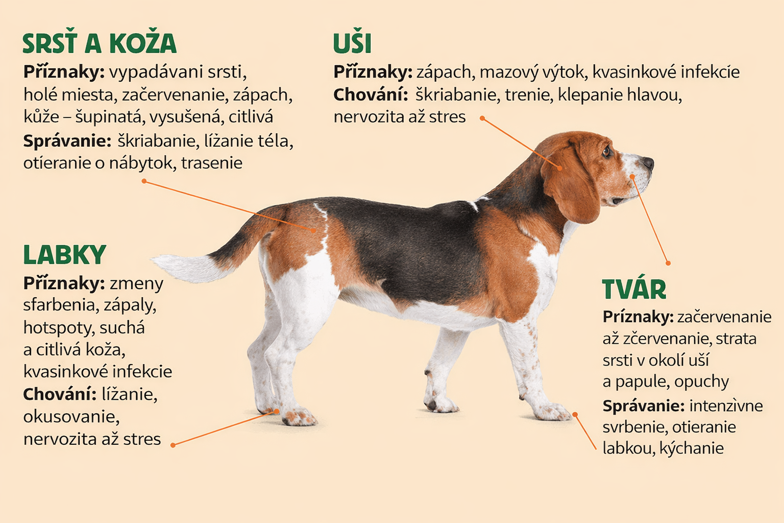 Prejavy sú najmä svrbenie, škrabanie, začervenanie kože, problémy so srsťou, hnačky či vracanie.